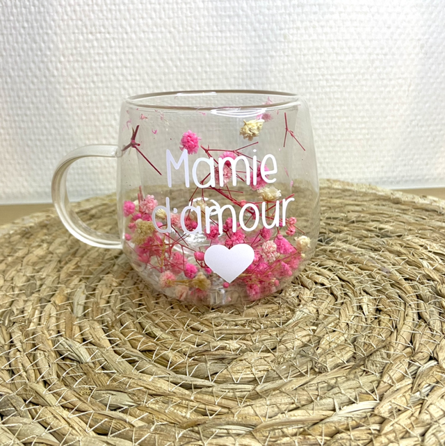 Ces tasses en verre double paroi sont personnalisées avec un prénom ou un doux message, et accompagnées de fleurs séchées colorées qui apportent une touche délicate et originale.